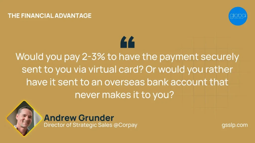This example highlights how virtual card payments can improve cash flow and generate additional income through float. Andrew also emphasized that virtual cards offer more secure payment methods: “You’re more secure ’cause the virtual card in an accounts payable world […]you have a secure one-time use, typically exact amount that’s being facilitated to the vendor and supplier.”